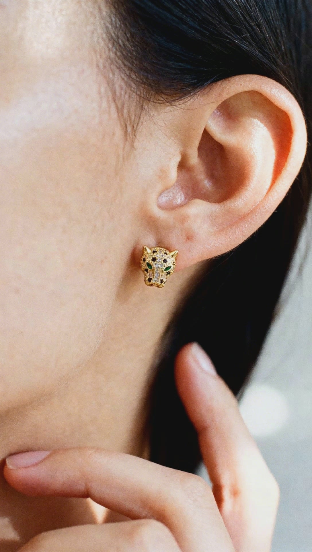 Motiv pantera symbolizuje sílu a eleganci. Miniaturní pavé kamínky vytvářejí jemný „star-dust“ třpyt, zatímco zelené oči přitahují pozornost a krásně ladí se zlatým finišem. Silueta je kompaktní, takže nepřetěžuje ušní lalůček, a přesto zůstává výrazná.